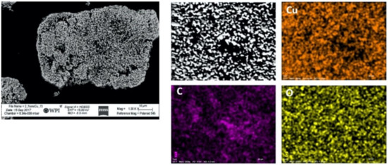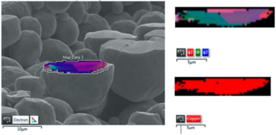 As can be seen in Figure 6 and Figure 7, the location of oxygen relative to the powder microstructures and areas where Cu is present differs in terms of what could be considered zones of depletion. That is to say, given the dense nature of the GA Cu feedstock powder, Cu is found to be distributed throughout the entirety of the cross-sectioned powder particle shown in Figure 6 as one would readily expect. On the other hand, the oxygen is not equally distributed homogenously throughout the GA powder particle. Instead, there are numerable regions where oxygen appears to be depleted or absent and other locations where oxygen is highly concentrated. When compared with the EDS analysis showcased in Figure 7 for the spray-dried Cu powder, the location of oxygen shares a significant correspondence with the location of Cu. There are far fewer zones of depletion, and the areas where Cu and oxygen do not appear to be present are attributable to the 50% porosity associated with this feedstock, which was revealed in Figure 5.