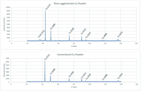 Within the materials science and engineering community, PXRD analysis and characterization has enjoyed wide-ranging success. As such, it has been applied to the study of crystallite size, phase identification, the quantification of residual stress concentrations from plastic deformation, and dislocation density estimation [61]. Given the differences associated with the chemical analysis reported in Figure 6 and Figure 7, PXRD was applied herein to identify any differences between the Cu-oxide species present in the GA Cu versus the spray-dried powder. As shown in Figure 8, the hypothesized variation between the Cu-oxide species is confirmed where Cu2O was identified within the spray-dried powder but not within the GA Cu powder.