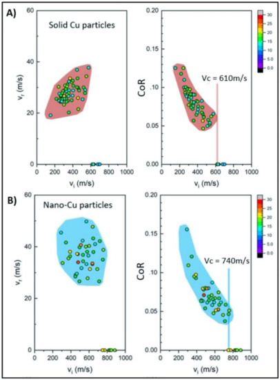 Vr and CoR vs. Vi for (A) GA Cu (labeled as “Solid Cu particles”) and (B) spray-dried Cu (labeled as “Nano-Cu particles”) powder.