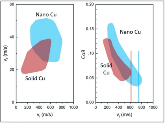 Reformulation of the Vr vs. Vi and CoR vs. Vi for GA Cu (labeled as Solid Cu) and spray-dried Cu (labeled as Nano Cu) powder.