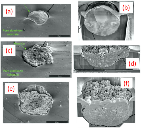 Micrographs of “as-impacted” and cross-sections of the single-particle impacts from advanced LIPIT study of a GA Cu powder particle at 701 m/s shown in (a) and (b), respectively, and spray-dried Cu powder particles at 770 m/s in (c) and (d), respectively, and spray-dried Cu powder particles at 884 m/s in (e) and (f). The black arrows are indictive of interesting bonding and deformation features (such as pore densification and particle/substrate void formation in (d) and mechanical interlocking in (b)).