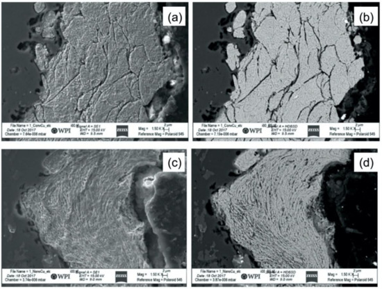 Figure 2 presents the internal microstructures of both the GA Cu and spray-dried Cu after cross-sections of each of the powder particle types were prepared using standard metallographic techniques described in the Methods and Materials section. In addition to being prepared for microscopy by way of mounting and polishing, the resultant cross-sectioned samples were chemically etched according to the Methods and Materials section to reveal grain boundaries associated with the rapidly solidified GA powder in comparison to the spray-dried agglomerated powder. Regarding Figure 2, micrographs were observed using a HDBS electron detector for the chemically etched GA powder cross-sections as shown in Figure 2a,b. At the same time, similar micrographs were obtained for the spray-dried powder in Figure 2c,d.