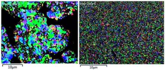 Given the 60–80 nm size of the Cu nanoparticles housed within the spray-dried powder, as well as the porosity associated with the spray-dried powder particles, the resolution and scanning strategy associated with EBSD analysis was unable to resolve the crystallographic orientations and crystallite diameters for the spray-dried powder. That being said, EBSD analysis was achieved for the GA Cu as shown in Figure 4. In contrast with the microstructural features that are observable in the GA Cu powder, which was etched and presented in Figure 2a,b, the EBSD data showcased the presence of grains with large-angle grain boundaries and established the presence of what has been referred to elsewhere as sub-grains, but can also be considered as one crystallite constituent within a cluster of small-angle grains relative to one another. By definition, high-angle grains may be regarded as regions within a polycrystalline material that house small-angle grains. This definition of high-angle grains can be refined further by way of considering the fact that high-angle grains also maintain greater than 15 degrees of misorientation relative to their neighboring set of sub-grains, i.e., neighboring high-angle grain. Without the ability to study the crystallographic orientations, one would be unable to properly render the size of the observed microstructural features from HDBS micrographs alone due to the difficulty in differentiating between low-angle and high-angle grain boundaries.