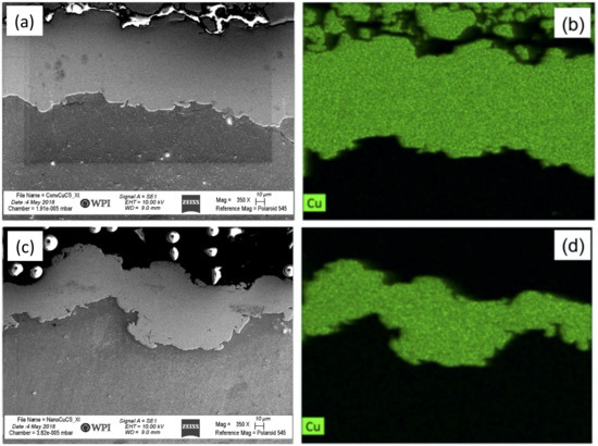 SEM micrographs of cross-sectioned and etched consolidated conventional Cu (a) and (b) as well as nanostructured cold sprayed Cu (c) and (d).