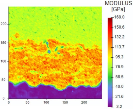 Traditional nanoindentation testing was performed using the iMicro Pro (Nanomechanics, Inc., now a KLA Company, Oak Ridge, TN, USA) with an InForce 50 mN actuator. The InForce 50 mN actuator was equipped with a Berkovich diamond indenter tip (Micro Star Technologies Inc., Huntsville, TX, USA). The Oliver–Pharr method was employed during the contact area function calibration process, and the hardness values were reported at a depth of approximately 250 nm [40,41].
