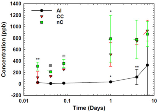Since the cold sprayed coatings were formed upon an alloyed Al substrate and the Cu coatings were not thick enough to be fully removed from the substrate, Cu ion release assays were performed upon a bulk alloyed Al sample as well as the two cold sprayed samples to account for any impurities or alloying elements in the Al substrate. The release of Cu ions from each of the samples was recorded from 30 minutes of exposure time to seven days. The parts-per-billion (ppb) of released Cu ions were determined using inductively coupled plasma mass spectroscopy in samples that were diluted 100-fold in H2O.