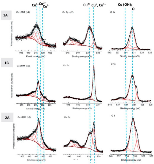 Due to the significant amount of carbon contamination associated with the cutting fluids and corrosion testing, attempts were made to delicately clean the Cu surfaces prior to X-ray photoelectron spectroscopy (XPS) analysis. Before XPS analysis, the samples were sequentially sonicated in acetone followed by isopropanol for 5 minutes. Cleaning detergents were avoided to not affect the surface chemistry being studied. XPS data and photoelectron spectra were acquired according to [45]. Analysis chamber base pressures were less than 10−9 Torr. A hemispherical energy analyzer that was positioned at 90° with respect to the incoming monochromatic Al Kα X-ray flux and 45° with respect to standard sample positioning collected the photoelectrons. Survey spectra utilized 117−eV pass energy, a 0.5−eV step size, and a 50-millisecond-per-step dwell time. High-resolution XP spectra employed a 23.5 eV pass energy, 0.025 eV step size, and a 50-millisecond dwell time per step. Spectra were acquired for the Al 2s, Al 2p, C 1s, Cu 2p, N 1s and O 1s photoelectron regions as well as the Cu LMM Auger transitional region. Post-acquisition data fitting employed Shirley-style baselines to all spectra based on a qualitative visual assessment of baseline shape. For a given oxidation state, fits that employ multiple peaks within a spectral region utilized identical full-width and half-maximum values for each peak to minimize mathematically optimized fits that were possibly chemically unrealistic [46]. Each of the areas was fit with Gaussian–Lorentz pseudo-Voigt peak functions. Lastly, Cu 2p features ascribed to CuO and Cu1+ utilized an asymmetric tail function [25].