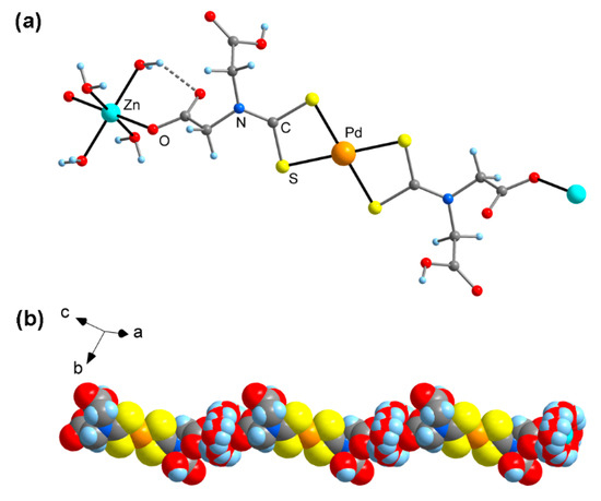 Molecular structure of Zn[Pd(HL)2] (3-Pd) · 6H2O in the crystal (non-coordinated crystal water omitted for clarity). (a) Ball-and-stick model of one formula unit; (b) Representation of the one-dimensional polymeric structure (space-filling model, showing rotational disorder of the Zn(H2O)4 units).