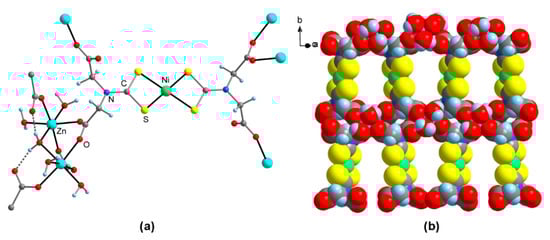 Coordination polymers are potentially able to form three-dimensional porous structures, so-called metal-organic frameworks (MOFs). In the recent decade, compounds containing more than one different metal have attracted significant research interest, as they can exhibit completely different properties than their homometallic analogs, offering new reaction patterns and novel fields of application [1,2,3,4]. An efficient strategy for the construction of heterobimetallic coordination polymers is a sequential approach, using a metal complex with free donor groups in the backbone of the ligands, being able to coordinate to a second metal (“metalloligand” or “metallolinker”) [1]. While many ligand systems that are potentially suitable for this approach are difficult to synthesize and therefore expensive, dithiocarbamate-functionalized carboxylates (DTCC) are very easily accessible from commercially available amino carboxylic acids and can coordinate selectively to a soft (thiophilic) and hard (oxyphilic) metal center at the same time (Scheme 1) [5]. In a recent contribution, we demonstrated that polymeric structures can be constructed using platinum(II) and zinc for this purpose [6]. Thereby, DTCC ligands derived from sarcosine and L-proline result in the formation of zigzag-chain or helical structures, respectively, while the iminodiacetic-acid derived DTCC ligand {SSC-N(CH2COO)2}3− (L) forms a two-dimensional array with platinum(II) and zinc ions. The latter compound has been found to be significantly more thermally stable than the one-dimensional coordination polymers and decompose at 398 °C under nitrogen [6]. Since platinum is a less abundant and expensive metal, which detracts from the attractivity of the resulting materials for applications, we were interested in the question if comparable coordination polymers can be obtained using the cheaper metals palladium or nickel. Several nickel(II) and palladium(II) dithiocarbamates are described in the literature, and their molecular structures are closely related to those of the corresponding platinum(II) complexes. In November 2019, the Cambridge Structural Database (CSD) contained ca. 170 entries on homoleptic Ni, Pd, and Pt bis(dithiocarbamate) complexes, in which the metal is always coordinated by two chelating sulfur ligands in a square-planar fashion [7]. As previously reported by Leka et al., the potential metalloligands [M(H2L)2] (M = Ni, Pd) are readily available from (NH4)3(L) and an appropriate metal salt in aqueous solution, followed by protonation of the carboxylate groups with hydrochloric acid [8]. In the present study, we have investigated if these compounds can be used for the straightforward synthesis of Zn/Ni or Zn/Pd heterobimetallic structures. We report here four new heterobimetallic coordination polymers, including their spectroscopic characterization (IR, NMR), thermal and magnetic properties, and crystal structures.