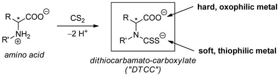 General synthesis of dithiocarbamato-carboxylate (DTCC) ligands from amino carboxylic acids and their potential ability to coordinate hard and soft metal centers selectively (R, R′ = alkyl residues; * = potential chirality center).
