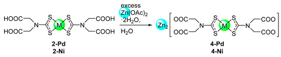Both 2-Pd and 2-Ni reacted cleanly with excess zinc acetate at ambient temperature (Scheme 4). The so-obtained aqueous solutions afforded crystals of Zn2[M(L)2] (4; M = Ni, Pd) · 14H2O, which showed partial loss of crystal water upon isolation. Accordingly, yellow Zn2[Pd(L)2] (4-Pd) · 12H2O and green Zn2[Ni(L)2] (4-Ni) · 2H2O were obtained in good isolated yields. However, running the reaction of 2-Ni at elevated temperature led to color change of the solution from intense green to pale brownish-green (cf. Figure S1 in Supplementary Information, SI), and a yellow-green powder (5-Ni) could be isolated. This product gave identical elemental analyses results as 4-Ni, and, therefore, it could be assumed that its composition was also Zn2Ni(L)2 · 2H2O. All three products 4-Pd, 4-Ni, and 5-Ni are sparingly soluble in water and insoluble in the usual set of organic solvents. We forewent characterization of the products by powder X-ray diffraction in order to prove their phase purity, as the partial crystal water loss and potential presence of more than one crystalline polymorphic form did not allow for a reasonable comparison with the single-crystal data. These problems were outlined in detail previously for a series of related Zn/Pt coordination polymers [6]. Upon heating the products under nitrogen, the residual water was completely released around 110 °C for 4-Pd and 4-Ni, and at 127 °C for 5-Ni (cf. Figure S6 in the SI). Thermal decomposition was detected at 377 °C (4-Pd) and 348 °C (4-Ni), which is lower than for the related 4-Pt (398 °C [6]; cf. Table 1). However, the decomposition temperature of 5-Ni is considerably increased to 387 °C as compared to 4-Ni. Magnetic measurements revealed that both nickel compounds 4-Ni and 5-Ni are diamagnetic, and, therefore, an exchange of the Ni and Zn sites could be ruled out for 5-Ni. Coordination of Ni2+ by carboxylic groups would most likely lead to an octahedral coordination and, therefore, to a paramagnetic nature of the compound.