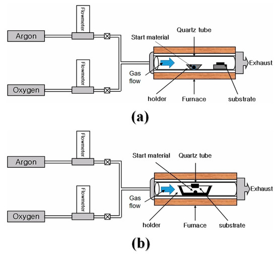Schematics of thermal chemical-vapor deposition (CVD) setups in this study: (a) parallel and (b) perpendicular setups.