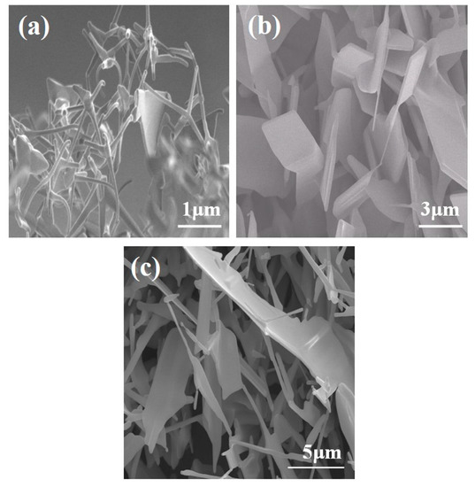 Figure 5 shows FE-SEM images of ZnO nanostructures grown in a perpendicular setup on Si substrates without the Au catalyst as a function of growth temperature. As shown in Figure 5a, ZnO nanostructures grown at 700 °C had many nanowires and some nanosheets that were randomly oriented. The ZnO nanostructures grown at 800 °C, as illustrated in Figure 5b, had many nanowires and some ZnO nanobelts that had widths ranging from 1 to 2 μm. As seen in Figure 5c, ZnO nanostructures grown at 900 °C had many nanoplates and a few nanowires. Thus, we can confirm that ZnO nanobelts with wide widths can be synthesized in growth process without introducing a catalyst [30]. In all samples, ZnO nanostructures were randomly oriented because the Au catalyst was not used in the growth process. This is related to the formation of a polycrystal ZnO film without the preferred orientation at an initial growth stage [31]. Therefore, growth temperature in the perpendicular setup without the Au catalyst was an important parameter that could be used to control the morphologies of ZnO nanobelts under suitable growth conditions, such as under specific partial oxygen pressure or with the use of specific substrate-setup positions.