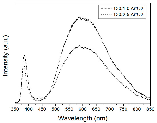 Photoluminescence (PL) spectrum of ZnO nanoplates and branched nanowires grown on Au-coated Si substrates in parallel setup with varying Ar/O2 flow rates of 120/1.0 sccm (dotted line) and 120/2.5 sccm (dashed line).