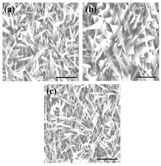 Figure 4 shows FE-SEM images of ZnO nanostructures grown in the perpendicular setup on Au-coated Si substrates as a function of growth temperature. According to Figure 4a, the ZnO nanostructures grown at 700 °C had many nanosaws and some nanorods that were randomly oriented. As shown in Figure 4c, ZnO nanostructures grown at 900 °C had many nanowires and a few nanosaws. Contrary to these results, as illustrated in Figure 4b, ZnO nanostructures grown at 800 °C had vertically oriented ZnO nanosaws with a tapered shape. Therefore, growth temperature was a key parameter that could be used to control the morphologies of ZnO nanosaws. It is well known that ZnO nanosaws are synthesized by the catalyzed growth of the Zn-terminated (001) surface, while the O-terminated (001) surface is relatively chemically inactive [28]. Moreover, the morphology of ZnO nanostructures is determined by growth temperature, which is related to surface energy including polarization and termination [29]. As such, it is suggested that a growth temperature of 800 °C resulted in self-catalyzed growth, yielding tapered and vertically aligned nanostructures, as shown in Figure 4b.