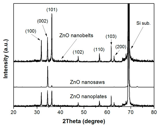 Figure 6 shows the XRD patterns of the ZnO nanoplates (Figure 2b), nanosaws (Figure 4b), and nanobelts (Figure 5b) grown via the thermal CVD method. The XRD patterns exhibited a large peak at about 69.16° corresponding to the Si substrate. All samples exhibited diffraction peaks of (100), (002), (101), (102), (110), (103), (200), and (112) planes, consistent with the hexagonal wurtzite structure (Joint committee on powder diffraction standards (JCPDS) no. 89-1397). This indicated that morphological changes in the ZnO nanostructures seldom affected the crystal structure. The diffraction peak of the (002) plane for the ZnO nanoplates and nanobelts was weakly observed compared to that of the (101) plane, implying a weakly preferred orientation in the c-axis direction. However, a strong diffraction peak of the (002) plane and a very weak peak of the (101) plane for the ZnO nanosaws were observed, implying highly (002) plane-oriented growth. It is known that, in ZnO, a faster (001) growth direction is due to the higher surface energy of the polar plane. Therefore, a high (002) plane orientation indicated that most of the ZnO nanosaws grew along the (001) direction. In addition, compared to the catalyst-free growth of ZnO nanostructures, the Au catalyst gave rise to the enhancement of a crystalline orientation, as shown in Figure 4, Figure 5 and Figure 6. This is based on the observation that catalyst-mediated growth led to crystalline nanostructures growing in specific crystallographic directions [32].