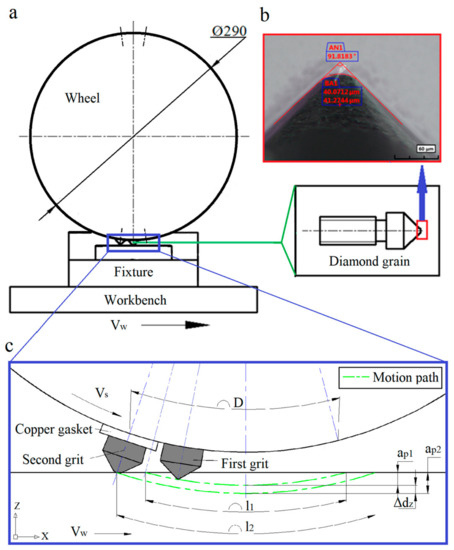 Prior to scratching experiment, the position of diamond tip on grinding wheel was calibrated by standard spacer to an accuracy of the Z-axis spacing along the DOC. Moreover, the parameter of dynamic balance is adjusted to 0.03 g to ensure the dynamic balance during the experiment at a linear speed of 30 m/s. To avoid the influence of the tool tip wear on the scratching result, the diamond tips was replaced after five scratches. The specific experimental parameters in the experiment are shown in Table 1.