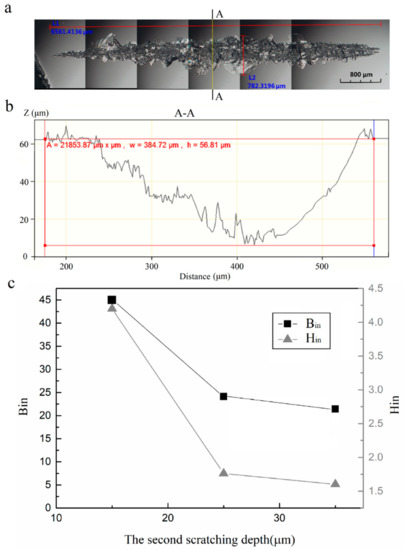 where l is the contact arc length, ap is the scratching depth, and Ds is the rotation diameter. According to Equation (1), the scratching depth of second grit is 35.2 μm in Figure 2a, corresponding to less than 1% variation to the setting value of 35 μm. This is because the double scratching experiment was performed after one tool-setting operation, and substantially the scratching depths should be the same. As shown in Figure 2a, a large number of pits appeared on both sides of the scratched groove, with the maximum size of approximately 350 μm in the middle of the groove. The maximum width of the groove is 782 μm, and the maximum depth of the groove is 56 μm.