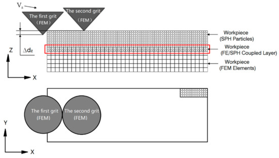 Figure 3 shows the two grits scratching model, where Δdz stands for the Z-axis spacing along the DOC between the two grits. In the model, these two diamond tips had the same conic geometry. The radius of the bottom circle was 250 μm, the height was 500 μm, the radius of the tip was 40 μm, and the front angle of the grit was −45 degrees (assuming that the grit is a rigid body). As Figure 3 shows, the two diamond grits were set as FE meshes, and the workpiece was divided into three parts: an SPH particle layer which was used to simulate material removal of workpiece, an FE/SPH coupled layer, and an FE mesh layer which was used to simulate small deformation and residual stress of workpiece. The size of the workpiece was 3 mm × 0.5 mm × 0.7 mm. Among them, the size of SPH particles was 3 mm × 0.5 mm × 0.5 mm and the size of each particle was 12.5 μm; the size of FE/SPH coupled layer was 3 mm × 0.5 mm × 0.05 mm; the size of FE mesh was 3 mm × 0.5 mm × 0.25 mm. In the SPH algorithm, the number of particles will greatly affect the calculation accuracy. To more accurately simulate the early stage of damage interference, the size of the double scratch model with a smaller z-axis spacing along the DOC was set to 300 μm × 120 μm × 8 μm. Among them, the size of the SPH part was 300 μm × 120 μm × 6 μm, and the size of each particle was 0.5 μm; the size of the FEM part was 300 μm × 120 μm × 3 μm; and the thickness of the FE/SPH coupling part was 1 μm.