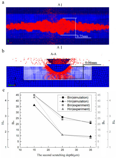 where hmax is the maximum depth of the groove, bmax is the maximum width of the groove, and ap2 is the scratching depth of the second grit. It can be seen that as the depth of the scratch increased, the values of the corresponding bin and hin were gradually decreasing. The trend of the bin and the hin began to decrease rapidly until it approached a threshold value. It is hence reasonable to conclude that the degree of damage interference in brittleness removal firstly decreased rapidly, but eventually reached a stable state. However, the damage interference that occurred in the dynamic double scratching process cannot be directly, and/or in situ, monitored, and the interference mechanism cannot be revealed merely experimentally.
