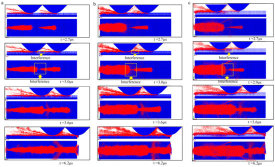 As can be seen from Figure 6b, when t = 2.7 μs, obvious lateral cracks generated by the first grit appeared at the bottom of the groove, and the width of the groove increased obviously. When the Δdz was increased, the damage degree increased gradually. When t = 3.0 μs, the same interference moment as the case with the Δdz = 0.5 μm, material damage interference occurred. At this moment, the material removal mode caused by the fist grit changes from plastic and brittle critical removal to a brittle removal, and the material removal mode caused by the second grit was still in a combined plastic-brittle removal mode. At t = 3.6 μs, the lateral cracks generated by the first grit interfered with the radial cracks generated by the second grit after multiple scratching, and the number and length of lateral cracks and radial cracks increased significantly. After the occurrence of interference, material damage continued to escalate. Especially, damage in depth direction significantly intensified. Comparing with the scratching at the Δdz of 0.5 μm, the width and depth of material removal generated by the second grit both increased. It also shows that the impact of the damage interference continues to increase in combined plastic-brittle removal mode with the increase of the DOC. Moreover, the effect of damage interference in the depth direction has priority over that of damage interference in the width direction.
