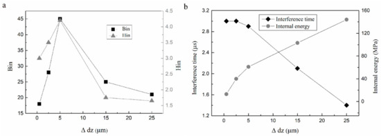 Figure 7a shows the variation of the hin and bin values in double scratching process with the Δdz of 0.5, 2.5, 5, 15, and 25 μm. When the Δdz was in the range of 0.5 to 5 μm, the bin and hin values increased gradually; when the Δdz value was in the range of 5 to 25 μm, the bin and hin values suddenly decreased. This also shows that the interference effect first increases and then decreases. The interference effect in the depth direction was significantly greater than that in the width direction for the Δdz of 0.5 μm and 2.5 μm. When the Δdz was 5 μm, the interference effect in the depth direction was almost same as that along the width direction. However, for the Δdz of 15 μm and 25 μm, the comparison was exactly the opposite. This indicates that although the hin and bin had the same trend with the Δdz increasing, the strength of the interference in the width and depth direction with different Z-direction spacings were not consistent. Figure 7b shows the variation trends of interference time and internal energy of two grits scratching with the Δdz of 0.5, 2.5, 5, 15 μm, and 25 μm. The interference time refers to the specific moment when the interference occurs, and internal energy is the sum of the energy required for all particles involved in motion. For the Δdz of 0.5 μm and 2.5 μm, interference time was the same, and internal energy increased faster relatively. However for the Δdz of 5, 15 μm, and 25 μm, the interference time was continuously advanced, and internal energy showed a linear trend; with the Δdz increasing, and the internal energy gradually increasing.