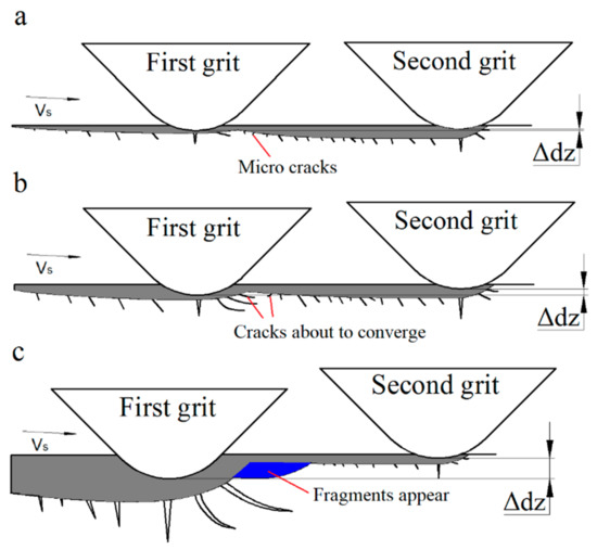 Figure 6c shows that when the Δdz is 5 μm, damage generated by the first scratching grit was further increased, i.e., changed from cracks to fragments. Moreover, the maximum width of the groove and the size of the cracks greatly increased. These results show that the material removal was complete in brittleness removal mode. When t = 2.9 μs, material damage interference occurs. Due to the formation of large fragments, the maximum width of the groove increased obviously, but the number of small cracks in the depth direction generated by the second grit decreased. However, due to the interference effect, material damage generated by the second grit was of a fragmentation feature and consequently, both the width and depth of the scratched groove obviously increased. It shows that when the depth difference changes from 2.5 microns to 5 microns, the material removal mode changes from combined plastic-brittle to brittle removal. In addition, the effect of damage interference in the width direction is far greater than that in the depth direction in the brittle removal mode.