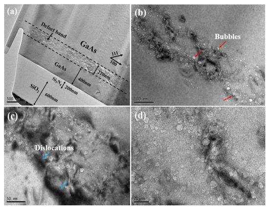 - Woo, H.J.; Choi, H.W.; Kim, G.D.; Kim, J.K.; Hong, W.; Lee, H.R. Hydrogen ion implantation mechanism in GaAs-on-insulator wafer formation by ion-cut process. AIP Conf. Proc. 2006, 308, 308–312. [Google Scholar]
