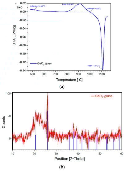 Thermal analysis of the pure GeO2 glass confirmed that it was crystallized above 700 °C (Figure 1a). The DTA curve showed an exothermic peak of the weak crystallization in the temperature range 750–1005 °C, with a Tx temperature of 916.4 °C. Above the temperature of 1005 °C, the beginning of the endothermic peak was observed, which can be explained as the melting of GeO2. For this reason, the quenched of pure glass had already contained a small amount of the crystalline phase, which was also observed on the XRD pattern (Figure 1b). The resulting phase of glass was identified as a hexagonal phase of GeO2 (ICDD® 01-083-2480).