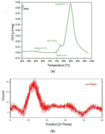It is well known that glass–ceramic technology is based on controlled nucleation and growth of crystalline phases in some glass. The behavior of the glass crystallization process can be examined utilizing thermal analysis. Therefore, the thermogravimetric studies of glass are essential for scientific interest to identify barriers to crystallization. Usually, the practical range of glass is between the glass transition temperature, Tg, and the crystallization temperature, Tx. It is known that controlled crystallization in this area leads to the formation of small crystalline particles that are distributed in the glass matrix [1,2]. Such kinds of materials are also of prime importance for optics. This is due to the formation in the glass matrix of nanocrystals containing activators, which are the source of their crystalline environment. However, it is also possible that the activator species, like ions or metal nanoparticles, can be directly excited and made to emit light without it. It is typical for a glass-like laser gain, but in such glass, the emissivity can be reduced by induced crystallization.