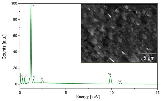 The qualitative and quantitative chemical compositions of 93GeO2–6Al2O3–1Bi2O3 material were confirmed via EDXS measurements. The chemical composition of samples deduced from the EDXS patterns allowed us to determine more precisely the chemical composition of samples, and they were taken from different parts of samples. An example of the EDXS analysis spectrum with the SEM micrograph of the examined glass is presented in Figure 4.