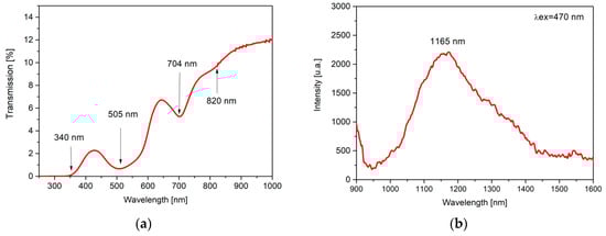 Subsequently, the optical transmission and the optical emission of the same glass were measured (Figure 5). The transmission spectra (Figure 5a) of the complex glass sample (thickness approx. 3 mm) showed a strong absorption in the UV range and the VIS range at approx. 505 nm and 704 nm. By excitation with blue light (470 nm), the glass emitted broadband with an emission maximum at 1165 nm (Figure 5b).