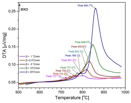 To the study of the kinetics aspect of the glass crystallization, thermal analysis was used. The glass making process was examined by the DTA measurements at the heating rate of β = 1, 2.5, 5, 10, and steps of 20 °C/min. Results are illustrated in Figure 6.