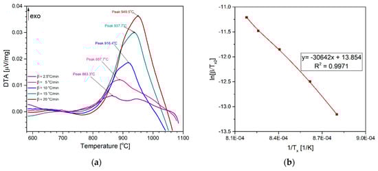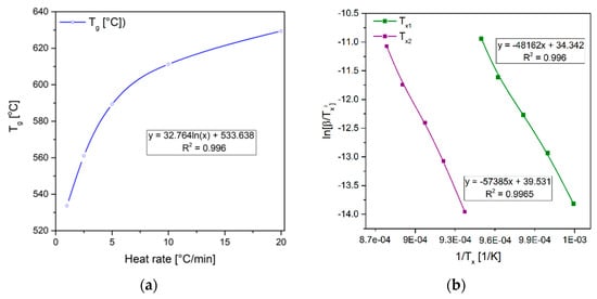 In turn, Tx values were used for the kinetic evaluation of the crystallization process, by the Kissinger method (Equation (2)) [29].