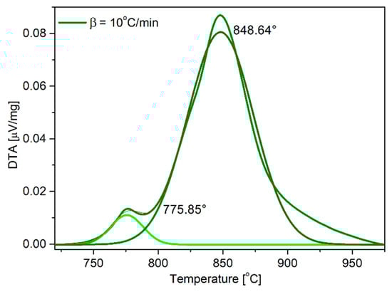 An example of the peak separation and the determined (Δ∗T) values and the Avrami coefficient (n) is shown in Figure 9. The characteristic temperatures of recorded measurements are summarized in Table 2. Since the two crystallization peaks overlap, a peak separation was carried out, and the required peak width was determined. For the two crystallization peaks, similar values of the Avrami coefficient n were calculated, which were in the range 1 < n < 2.