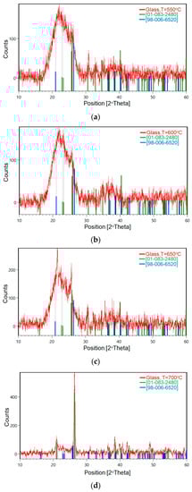 In order to determine the possibility of the partial phase crystallization in the glass matrix, some series of the XRD tests were performed. Measurements were recorded for selected temperatures used in the heat-treatment of the glass (at T = 550 °C, 600 °C, 650 °C, 700 °C/6h) (Figure 10a–d).
