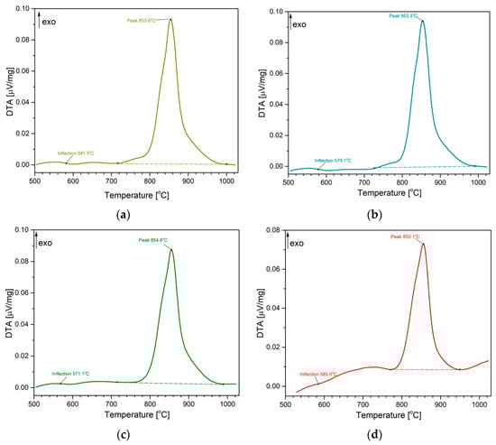 As was reported in [42] the mullite-like phases, such as the germanium-mullite types Al2GeO5, Al2,26Ge0,74O4,87, Al2,38Ge0,62O4,81, and Al2,4Ge0,6O4,8, tended to crystallize rapidly. These crystalline phases were dispersed in the amorphous phases of glass. Although the glass was heat-treated at 500–700 °C, it remained largely amorphous, as demonstrated by DTA analysis (Figure 11a–d).