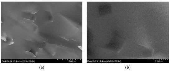 Except on the XRD and the DTA measurements after the heat-treatment of glass, all samples were studied under SEM microscopy. Figure 12 presents the fractured surface of the 93GeO2–6Al2O3–1Bi2O3 glass obtained at T = 600 °C. It was observed that the microstructure was reached in the form of crystalline objects (Figure 12a,b). These two types of crystalline objects had characteristic shapes, namely slack bars and square crystals. These elongated elements were identified as mullite-like phase crystals and square objects as a germanium oxide. It is known that the mullite phase crystallizes most often in the form of needles (prismatic needle shape).