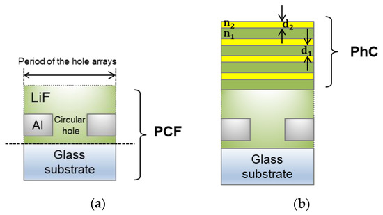 Previously, the fabrication process of the reference PCFs in Figure 1a has been reported, which adopted the laser interference lithography (LIL) method [15]. First, the coherent laser lights produce periodic patterns. Then, the photoresistive thin film is exposed by the interference patterns, and the following steps are the same as conventional photolithography, which is widely used in the industry. Compared to the conventional nano-patterning technologies such as electron-beam lithography and focused ion beam methods, the process revealed the possibility of the PCF fabrication in large area within short time. For comprising the proposed PhC-PCF in Figure 1b, the PhC consisted of LiF and tungsten trioxide (WO3) layers. Both materials can be deposited by thermal evaporation in the same chamber. The in situ process is also advantageous for large-area fabrication and cost effectiveness. The refractive indices were experimentally obtained from the thermally evaporated thin film. The LiF and WO3 layers were 72.5 nm and 45 nm thick, respectively, when calculated using (2) to achieve λPBG = 400 nm. The contrast ratio of the refractive indices of these two materials is 1.61, which is quite similar to that in the case shown in Figure 2c.