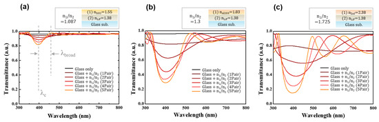 The larger the contrast ratio of the refractive indexes between two materials of the PhC (n1/n2), the more distinct the PBG; consequently, lower transmittance was observed around 400 nm. In contrast, in the case with five pairs, the minimum transmittance was 0.817 for the smallest contrast ratio (1.087 in Figure 2a) and 0.152 for the case with the largest contrast ratio (1.725 in Figure 2c). In addition, when the contrast ratio of the index values was large, the valley became narrower and deeper and more distinct corresponding to the use of more layers. In Figure 2b, for LiF/Al2O3 with n1/n2 of 1.3, the minimum transmittance of the two pair structure was 0.62 (412.2 nm), and it reduced to 0.292 (at 401.4 nm) for five pairs. For the LiF/ZnS structure shown in Figure 2c, the minimum transmittance showed a reduction in 72.9%, decreasing from 0.561 to 0.152 when the number of stacked layers increased from two pairs to five pairs. In addition, the valley became narrower, resulting in a change in λbroad from 120.6 nm to 97.8 nm under identical conditions.