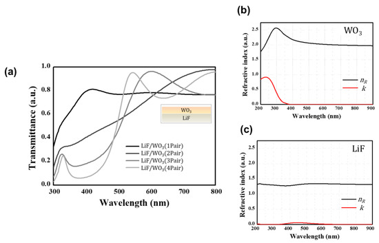 (a) Transmission spectra of multiple layers composed of Lithium fluoride (LiF) and tungsten trioxide (WO3) in free space. The measured refractive indices of the thermally evaporated thin films—(b) WO3 and (c) LiF.