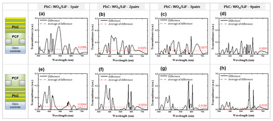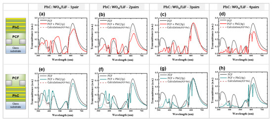 Transmission spectra of PCFs combined with 1D-PhCs (WO3 and LiF). (a–d) show the results for glass/PCF/PhC structures, and (e–h) show the results for glass/PhC/PCF structures. In all graphs, the dashed lines represent the product of PhC effects (in Figure 3) and the transmittance of the reference PCF.
