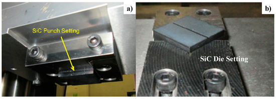 A cassette die set for the dry, cold forging process to be fixed between the upper and lower bolsters in the computer numerical control (CNC) stamper. (a) Upper die unit with a SiC punch and (b) lower one with a SiC core die.