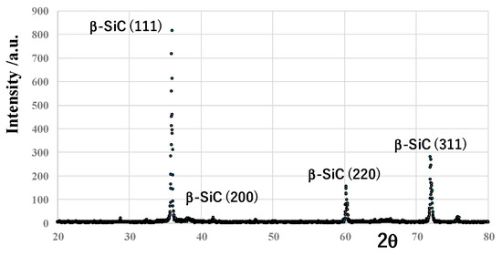 The CVD-coated SiC layer on the sintered SiC substrate with the thickness of 4 mm has a single phase of β-SiC and 3C-SiC crystallographic structure, as shown in Figure 4. In measurements, 2θ ranged from 20° to 80°, with the scanning speed of 5 mm/min and the step angle of 0.02°. Different from other PVD and CVD-coated SiC films, the amorphous phase with broad peaks was not detected by XRD analysis.