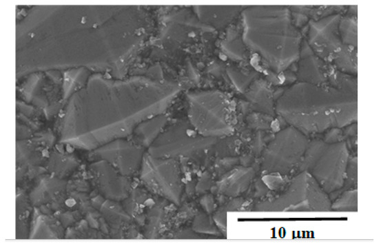 SEM image on this β-SiC coating is shown in Figure 5. The average grain size (Dgrain) was measured from this SEM image after chemical etching; Dgrain = 10 μm and free from extraordinary grain growth. This homogeneity in the microstructure is controllable by the present CVD process conditions.