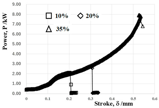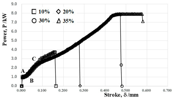 As stated in the above, the programed loading sequence in this CNC stamper is independently driven by four motors; the total power, as well as the stroke, are in situ monitored in the present forging experiment. Figure 7 depicts the relationship between the applied power and stroke in forging down the reduction by 10%, 20%, 30% and 35%, respectively. At point A, the punch commences to touch the wire surface; then, the wire is compressed in the axial direction up to point B. The flattening process of the wire head advances from this point. In the following reduction of the diameter, the contact interface area between the SiC coating punch and wire expands monotonously with increasing the reduction of the diameter. At point C, the lower part of the wire starts to fill into a cavity on the die. After this point, the work hardening of the AISI316 wires takes place together with flattening along the SiC coating punch head and filling into a die cavity until the applied power reaches a maximum of 8 kW.