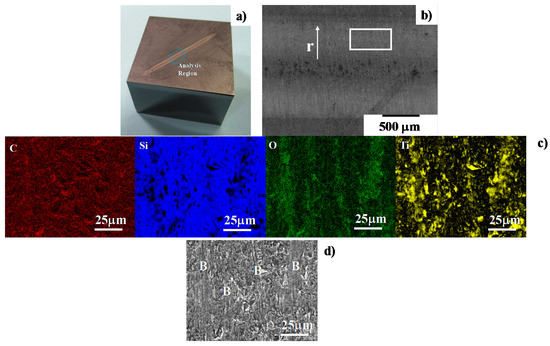 SEM and EDX analyses away from the center of the contact interface between the SiC-coated punch and the titanium wire after forging by 10 shots up to the reduction of the diameter by 35%. (a) Optical microscopic image on the SiC coating punch surface; (b) SEM image in low magnification on the contact interface of the SiC coating; (c) element mapping by C, Si, O and Ti and (d) SEM image in high magnification away from the center, where “B” represents the titanium oxide deposits.
