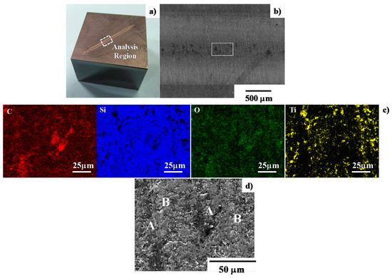 SEM and EDX analyses at the vicinity of the center of the contact interface between the SiC-coated punch and the titanium wire after forging by 10 shots up to the reduction of the diameter by 35%. (a) Optical microscopic image on the SiC coating punch surface; (b) SEM image in low magnification on the contact interface of the SiC coating; (c) element mapping by C, Si, O and Ti and (d) SEM image in high magnification at the center of the contact interface, where “A” indicates the high carbon concentration and “B” represents the titanium oxide deposits.