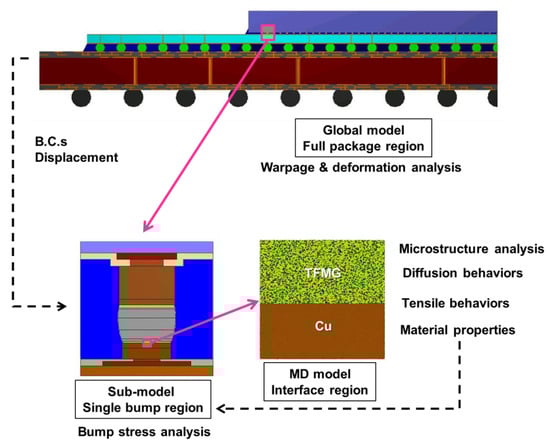 Thin film metallic glasses (TFMGs) are regarded as excellent diffusion barriers in integrated circuit applications [15]. In particular, refractory metal nitrides, deposited by reactive sputtering, were shown to be promising diffusion barriers. These kinds of barriers block the interaction between the interconnect materials and the silicon, and they are potentially useful as a diffusion barrier in other systems, in addition to those between the interconnect materials and the silicon [16,17]. Recently, TFMGs were gradually recognized and accepted as the most effective barriers layer for Cu metallization due to the absence of grain boundaries and immiscibility with copper [18,19,20]. Since the diffusion coefficient for Sn in Cu is 10 orders of magnitude smaller than that for Cu in Sn [21], IMCs are scarcely found and grown in Sn. As long as the diffusion of Cu from the Cu pad into the barrier layer can be effectively reduced, it represents that this barrier layer can also slow down the IMC growth. Zr–Cu–Ni–Al bulk amorphous alloy is a unique material due to its superior glass-forming ability and high strength [22]. As a potential candidate of TFMGs, its diffusion behavior and interface strength with the Cu layer are crucial and need further investigation. In this study, the material properties, especially diffusion behavior and strength, of ZrCuNiAl amorphous metal films were systematically examined using both numerical and experimental methods. Some important findings are illustrated in detail. The overall schematic diagram of this work is depicted in Figure 2.