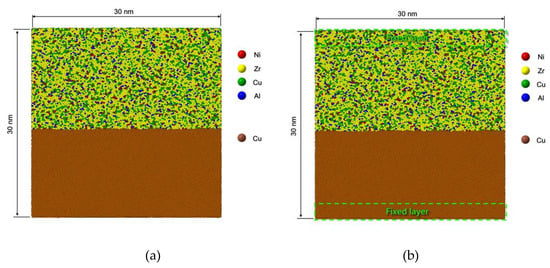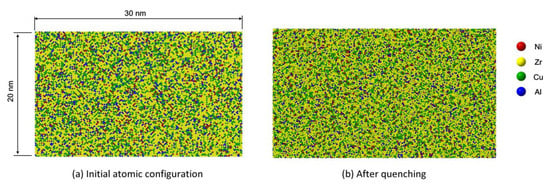 The initial structure of the molecular dynamics (MD) simulation model was constructed using the Large-scale Atomic/Molecular Massively Parallel Simulator (LAMMPS) ( a free and open-source software from Sandia National Laboratories, distributed under the terms of the GNU General Public License at https://lammps.sandia.gov/) [23] and the Open Visualization Tool (OVITO) package (a free and open-source scientific visualization and analysis package for atomistic and particle-based simulation data at https://www.ovito.org/) [24]. The embedded-atom method (EAM) potential was adopted to model the atomistic interactions among Cu, Zr, Ni, and Al atoms [25,26]. This potential was successfully applied to simulate the structure, surface, and transformation of amorphous metallics. The amorphous structure of the Zr–Cu–Ni–Al layer at a temperature of 300 K was obtained by performing simulations with specific parameter settings and heat treatments. Firstly, a crystal Zr–Cu–Ni–Al alloy was created with a face-centered cubic copper lattice of 185,000 atoms and enough copper atoms were randomly replaced with Zr, Ni, and Al in disordered substitution to give the system the desired composition. The system was initially relaxed under periodic boundary conditions at 300 K for 200 ps within a canonical ensemble (NVP) and then heated from 300 K to 2200 K at a constant heating rate of 5 × 1011 K/s to 5 × 1013 K/s. To make the state of the system as natural as possible, the liquid system was relaxed for 20 ps at 2200 K. Finally, the system was quenched from 2200 K to 300 K at a quenching rate of 0.5 K/ps, followed by relaxation for 20 ps at 300 K. This quenching rate is fast enough to achieve an amorphous phase. Figure 3 shows the atomic configurations of the Zr–Cu–Ni–Al model prior to and after quenching.